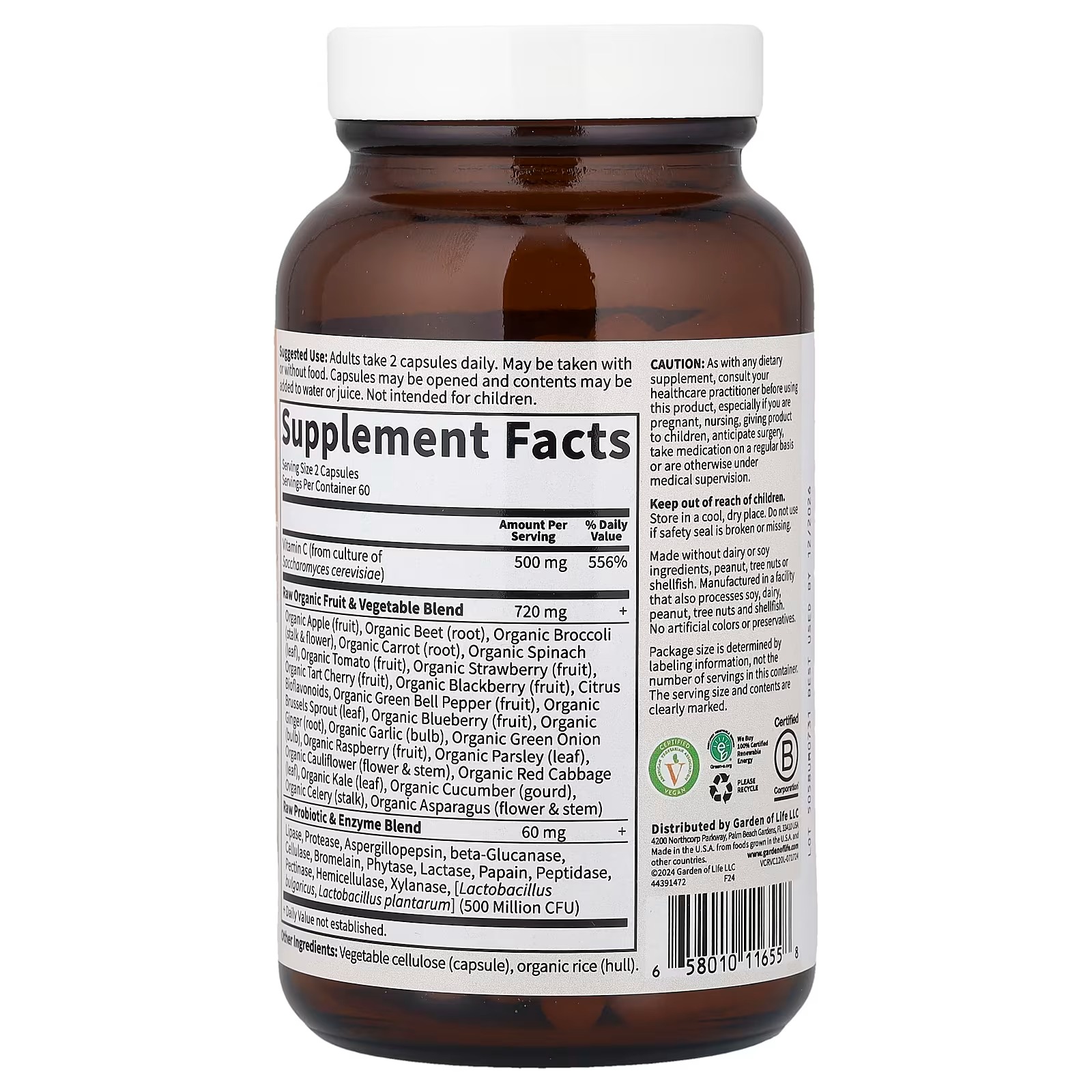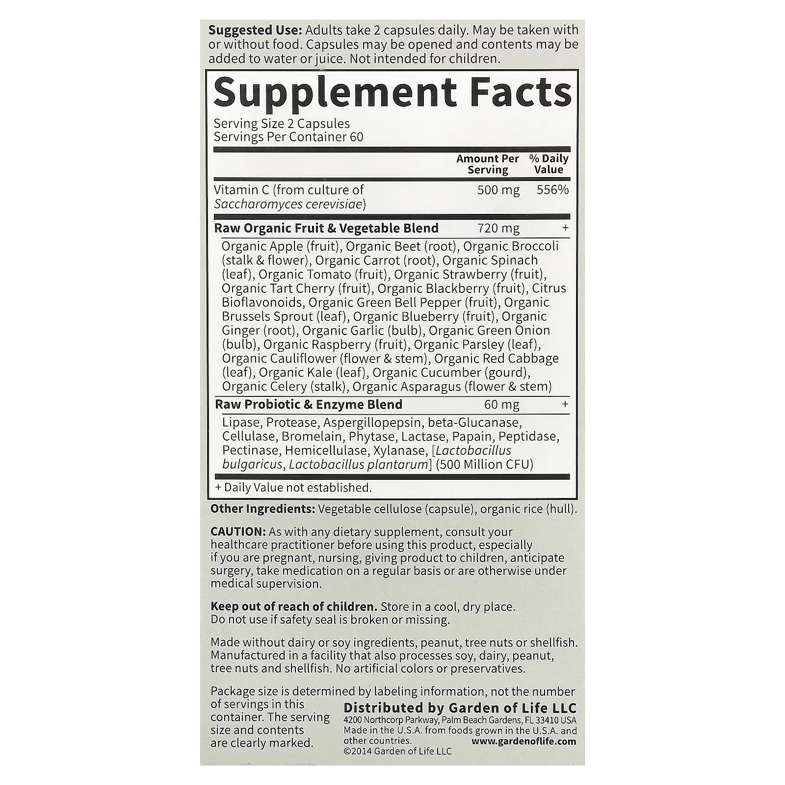 | Raw Organic Fruit & Vegetable Blend Organic Apple (fruit), Organic Beet (root), Organic Broccoli (stalk & flower), Organic Carrot (root), Organic Spinach (leaf), Organic Tomato (fruit), Organic Strawberry (fruit), Organic Tart Cherry (fruit), Organic Blackberry (fruit), Citrus Bioflavonoids, Organic Green Bell Pepper (fruit), Organic Brussels Sprout (leaf), Organic Blueberry (fruit), Organic Ginger (root), Organic Garlic (bulb), Organic Green Onion (bulb), Organic Raspberry (fruit), Organic Parsley (leaf), Organic Cauliflower (flower & stem), Organic Red Cabbage (leaf), Organic Kale (leaf), Organic Cucumber (gourd), Organic Celery (stalk), Organic Asparagus (flower & stem) |